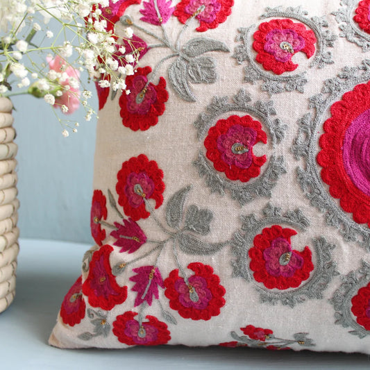 Red Round Butah Suzani Cushion Cover (14 by 20 Inches)