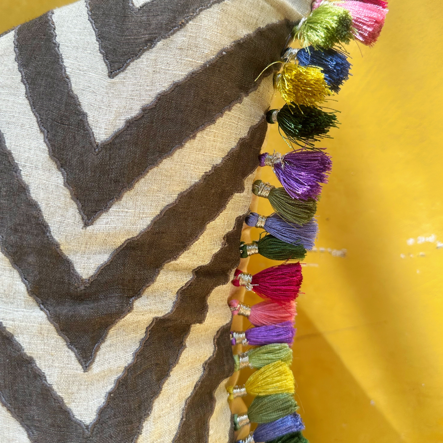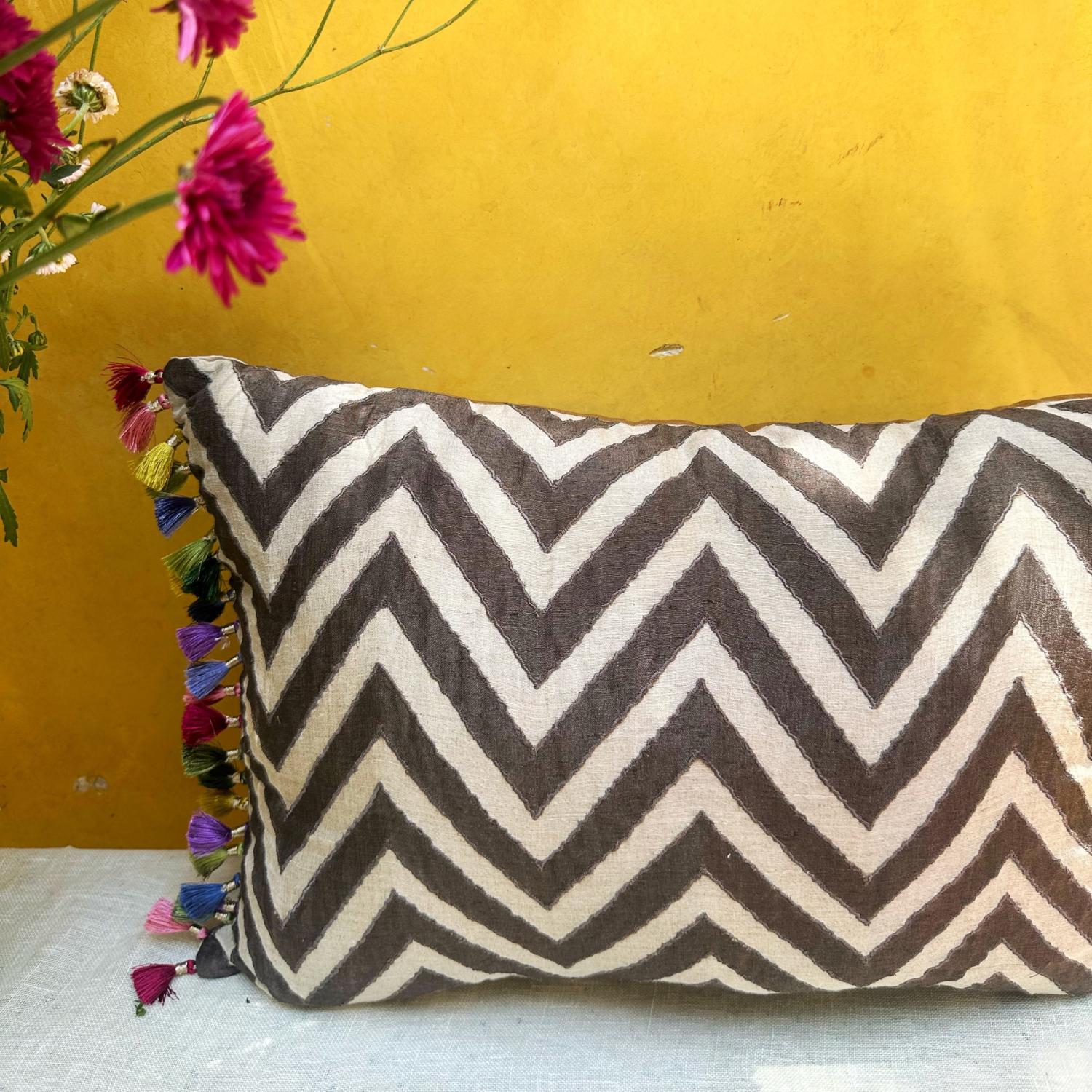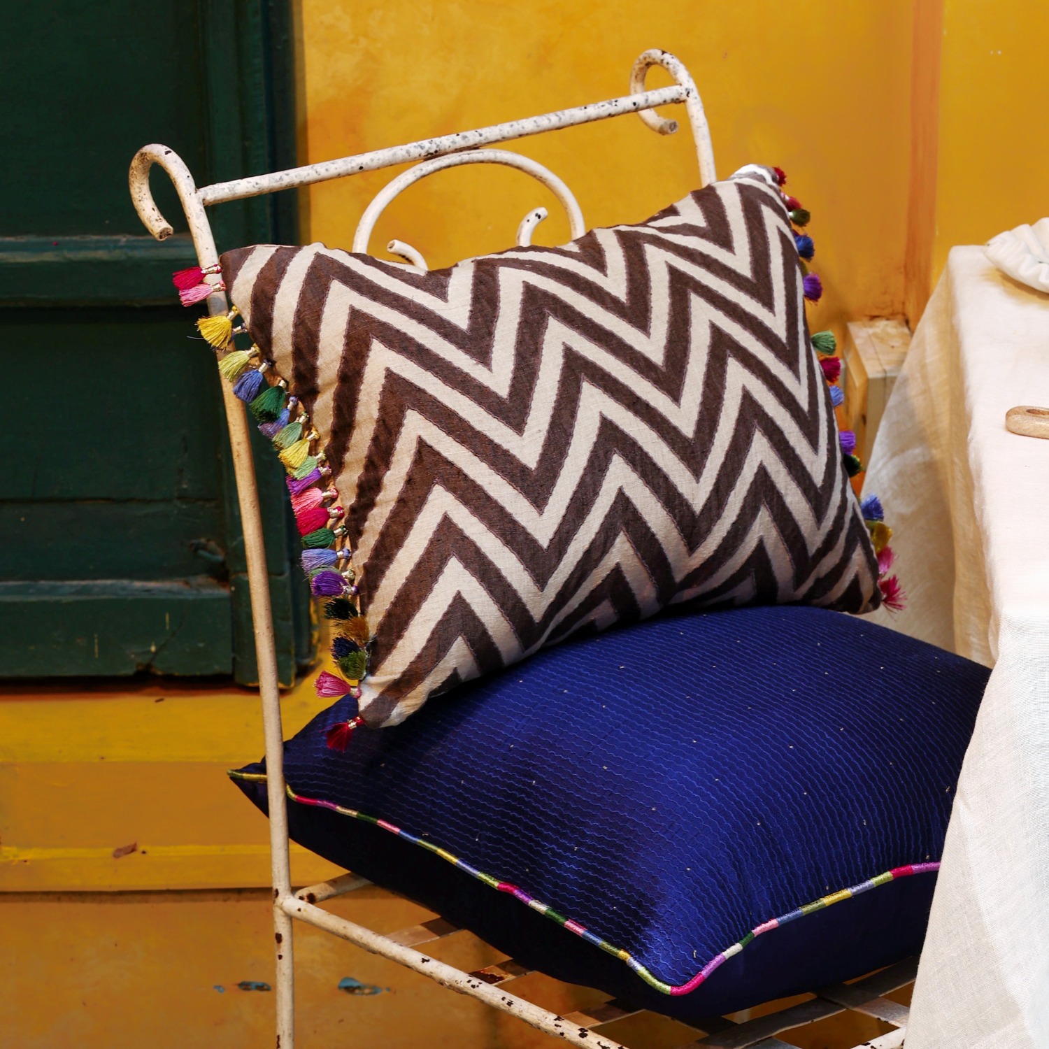 Featuring a classic chevron in black and white patchwork embroidered design. This cushion is elegantly accented with handcrafted tassels on both the sides.